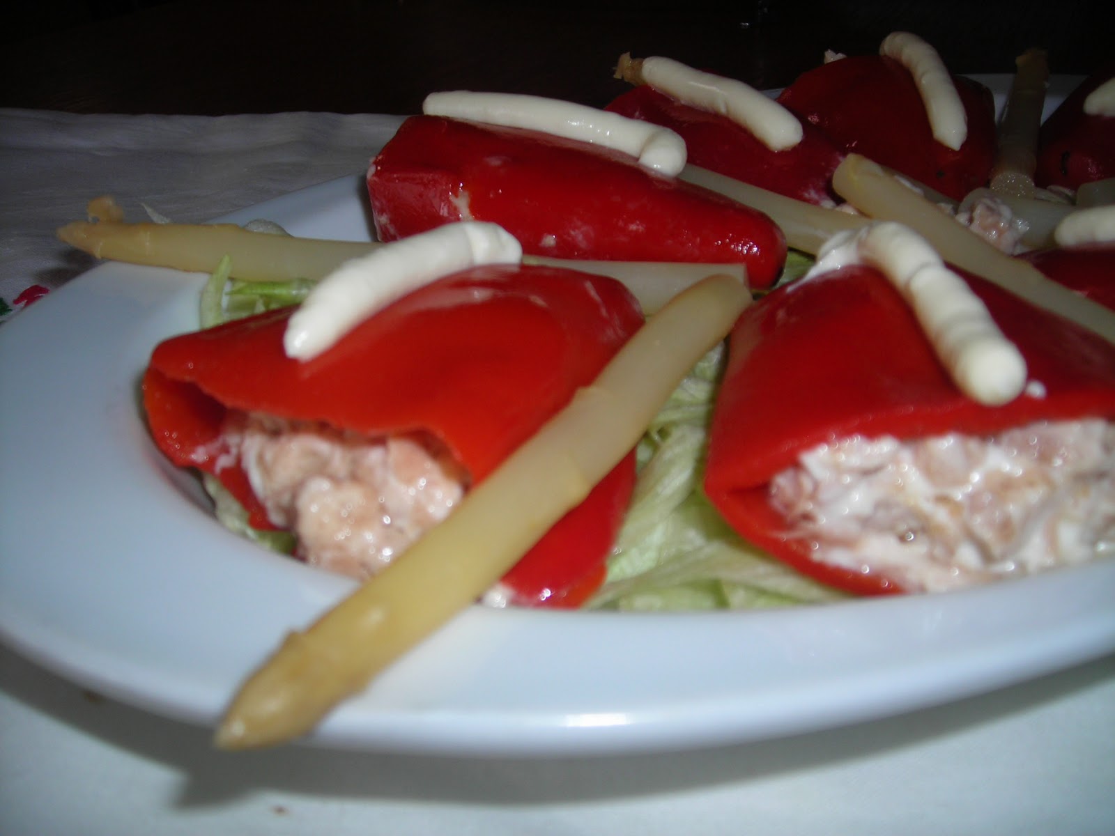 en una fuente de servir , ponemos el fondo con la lechuga cortada, encima los pimientos, adornamos por encima con un poco de mayonesa y por enmedio ponemos los esparragos
